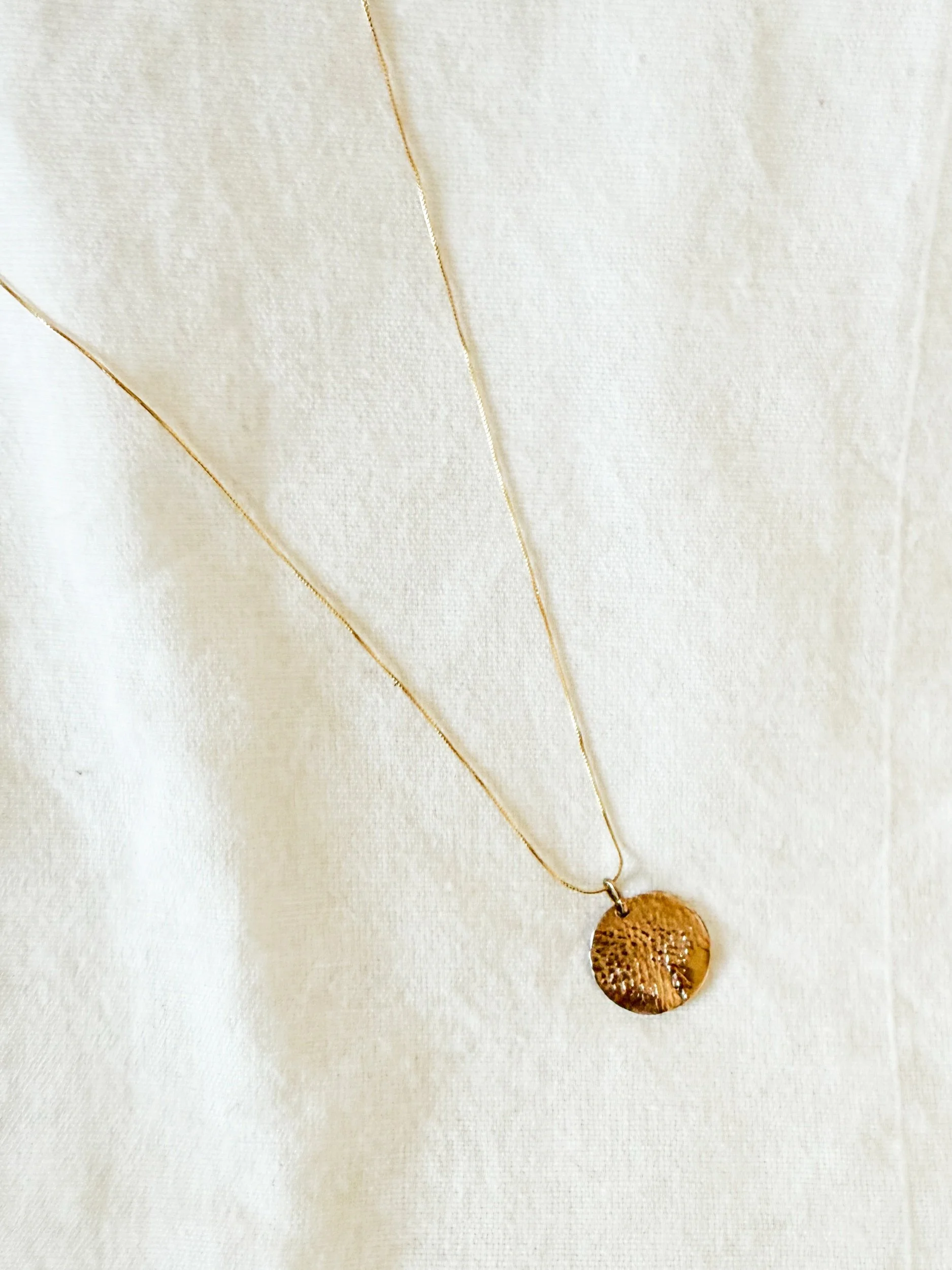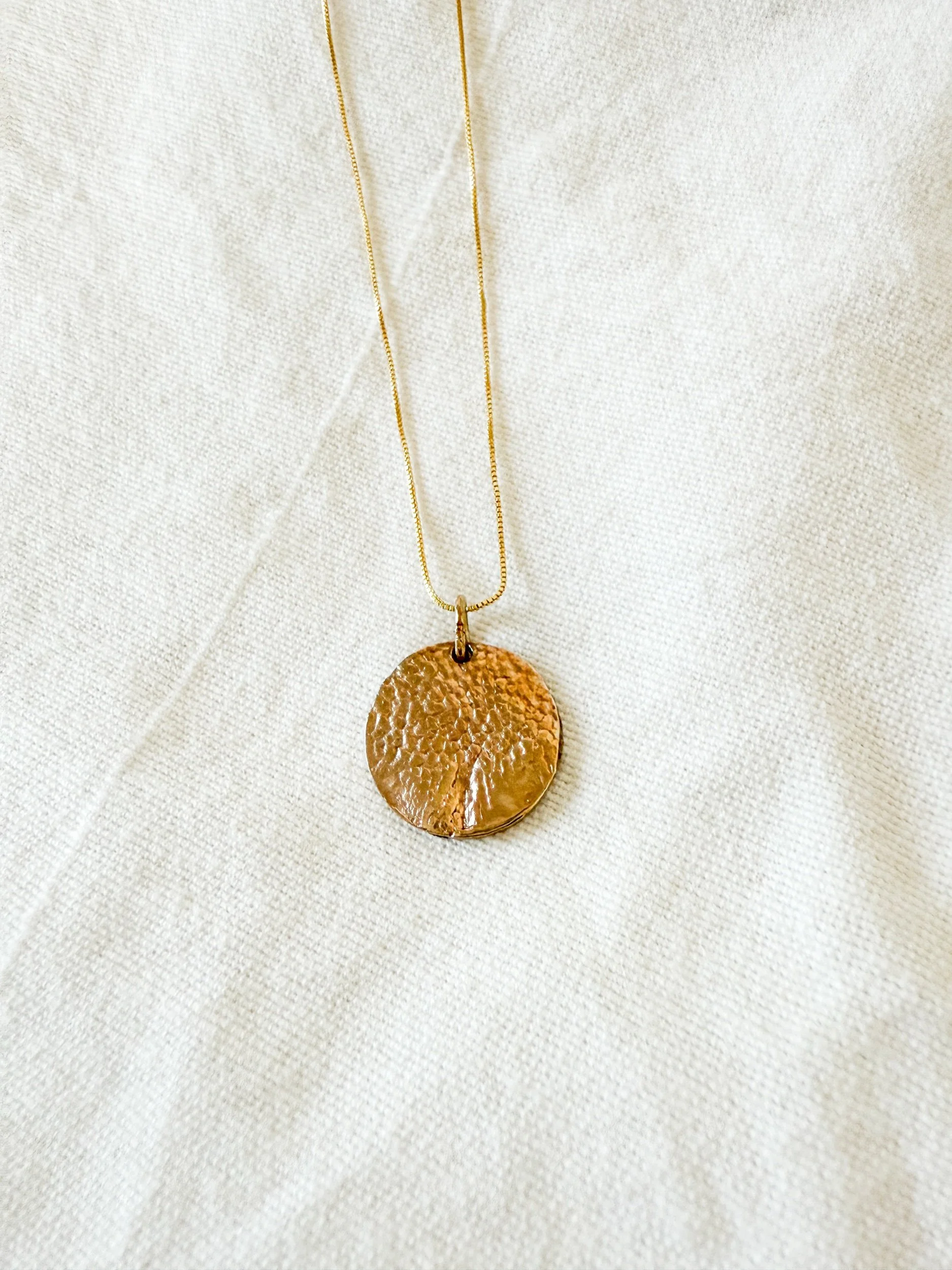 Approximately 18mm in size (a little smaller than a nickel). Free hanging. Made from solid 14k gold on a 14k gold chain.