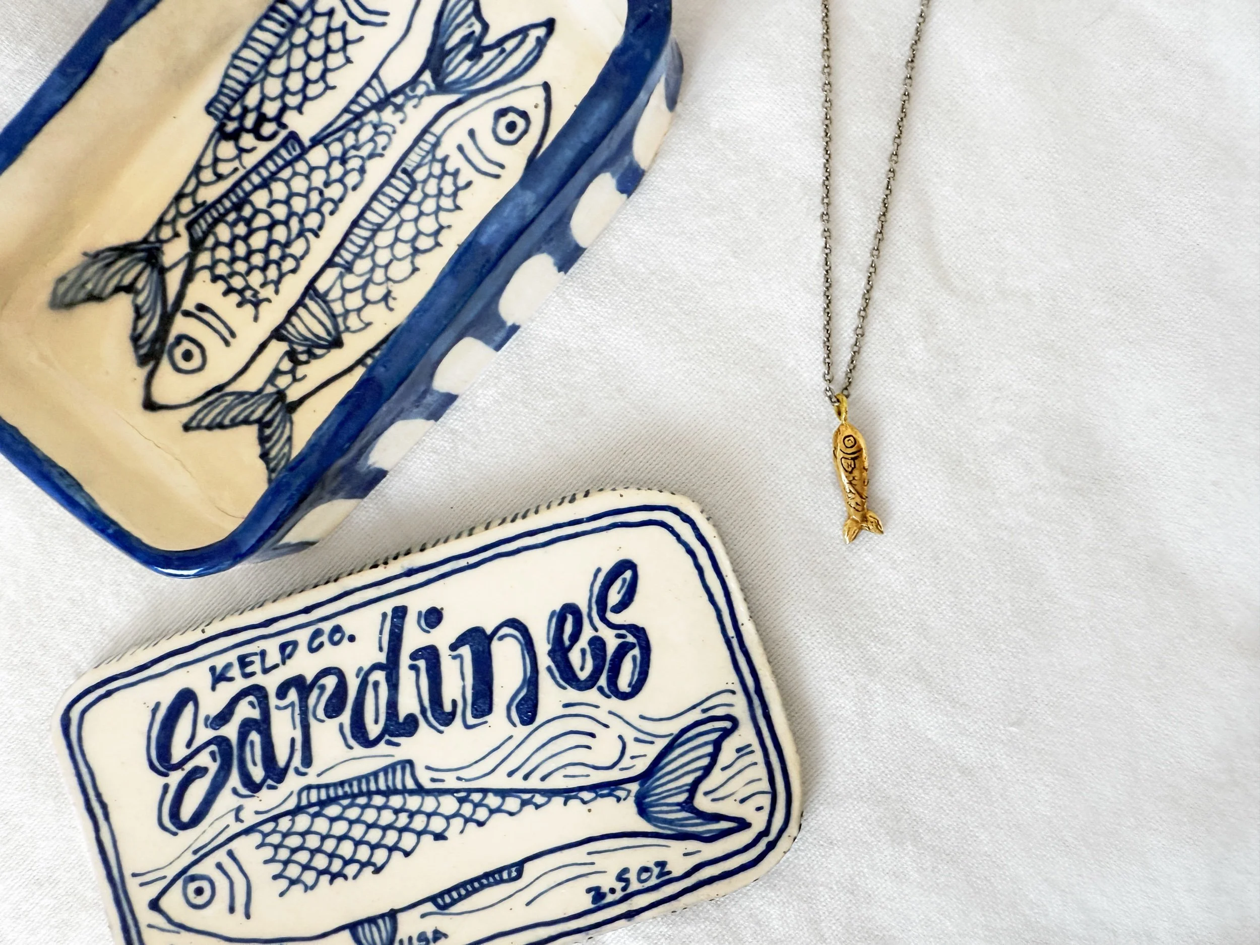 Add a truly unique ceramic sardine box measuring 3” by 5”. Each made my hand, no two are the same design.